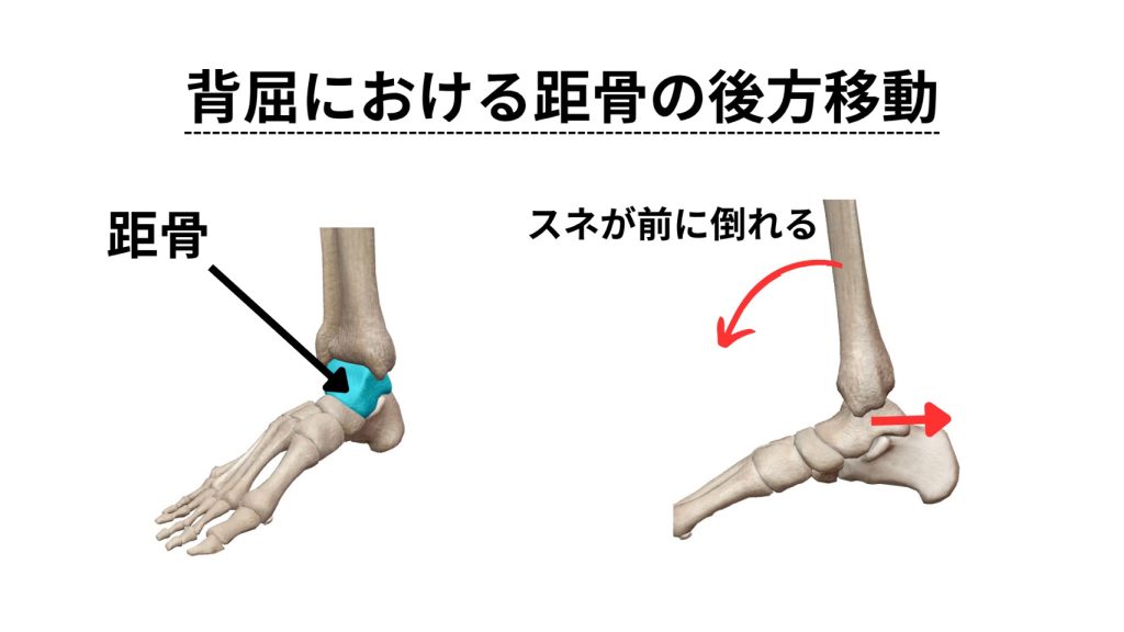 関節の動きを細かく見てみると、スムーズな背屈には足首の中央にある 「距骨(きょこつ)」 が後方に滑ることで上手くハマる構造になっています。