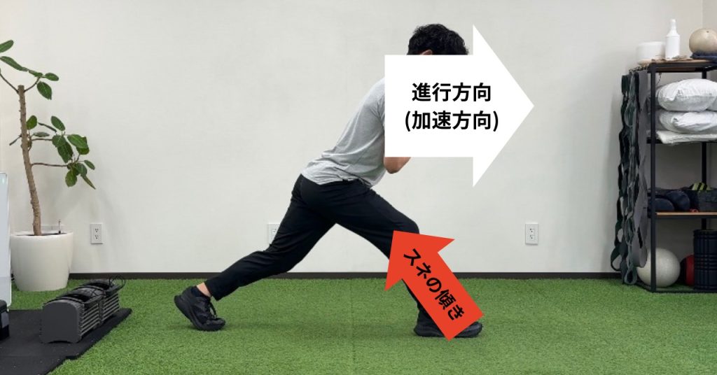 このとき、股関節を適度に曲げることで、お尻やもも裏の筋肉が伸ばされながら働き、加速によって生じた衝撃を吸収しています。
