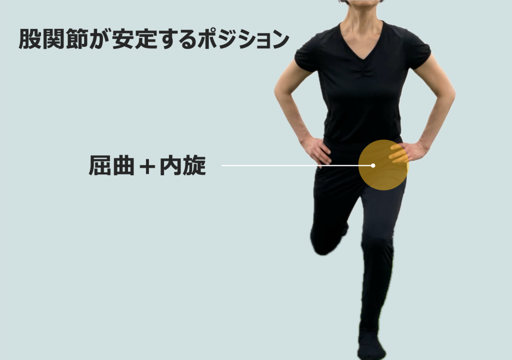 股関節屈曲+内旋のポジションは股関節を形成する臼蓋と大腿骨頭が安定する位置となります。